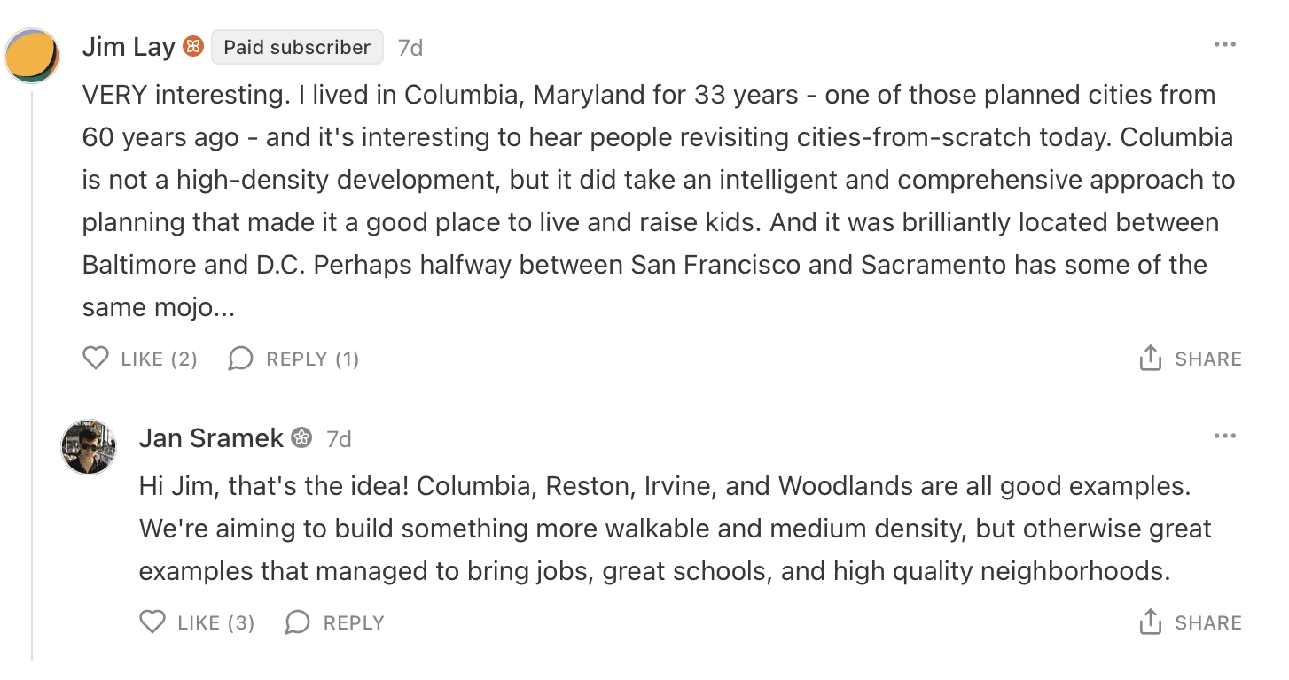 6. ✅ Community comment(s) of the month: as you could hear in the “how to design a brand-new city” episode, I was rather charmed by Jan Sramek’s plan, and what do you know, he’s answering listener questions in the Volts comments section: