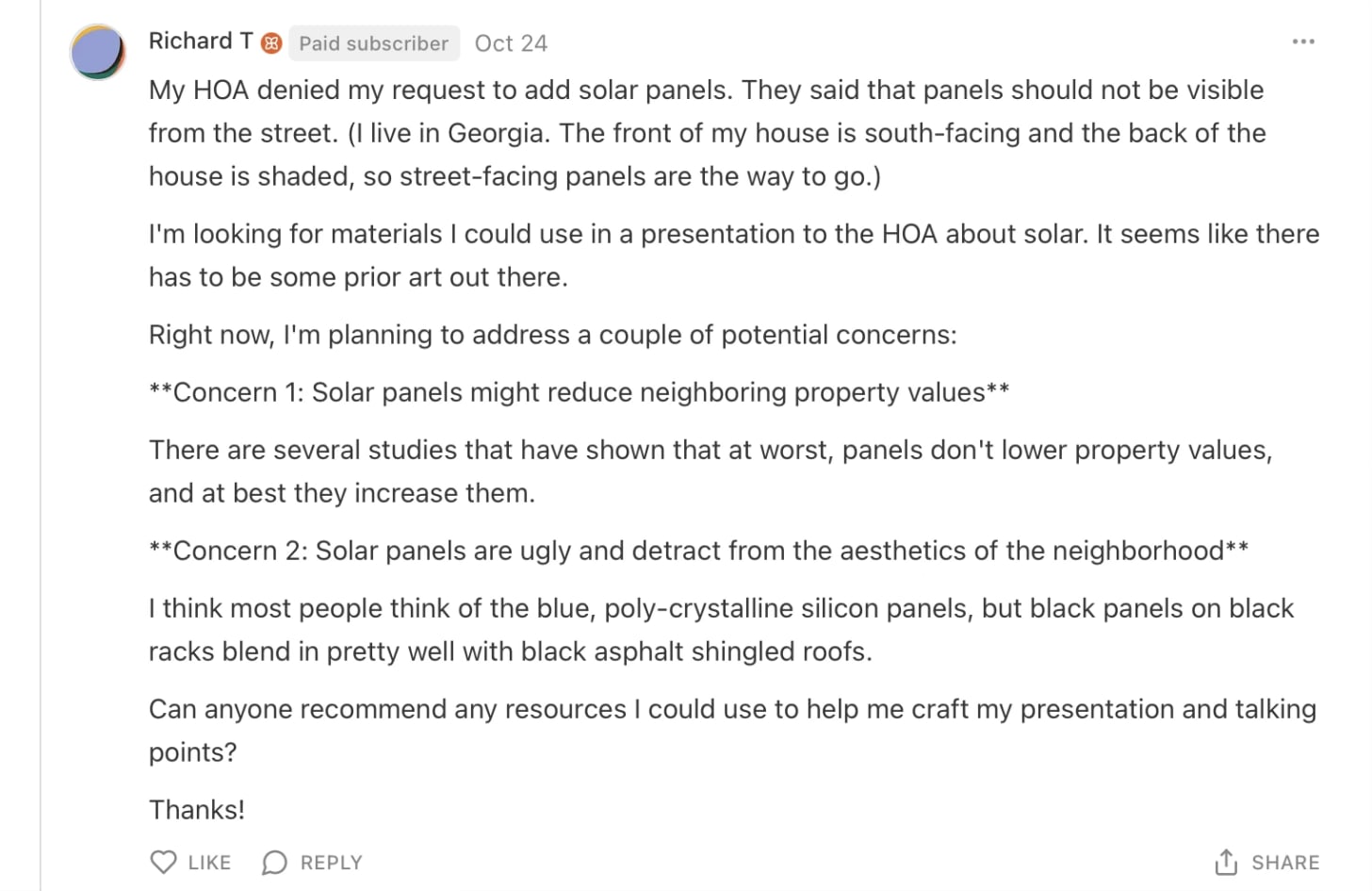 5. ✅ Community comment(s) of the month come from Christopher and Richard by way of last month’s community thread. Christopher is looking for your advice on his career transition and Richard needs your help to get past his HOA’s frustrating red-tape.